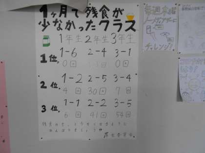 厚生委員会では、一ヶ月間の残食が少なかったクラスを紹介しています。栄えある各学年の第一位は・・・!?
