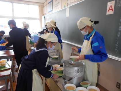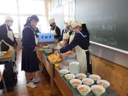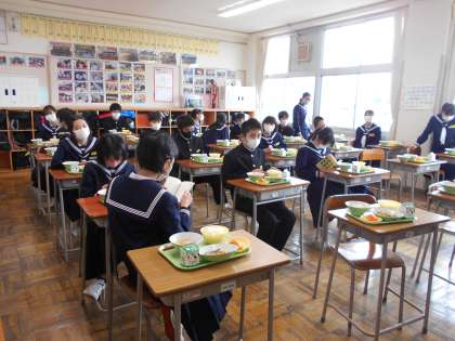 1年生 待ちに待った給食タイム! 公開日 2021/12/20 更新日 2021/12/20 1学年 12月20日(月) 今学期の給食もあと4日となりました。1年生は、今日もてきぱきと給食の準備を進めています。配膳中は、自分の座席で静かに待っています。 これも1年間で身に付けてきた習慣ですね。