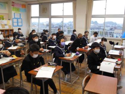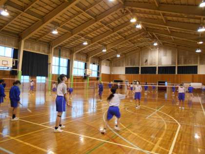 1−3、4体育:ダブルスでバドミントンをしています。時間が来るとローテーションするので、色々な相手と打ち合いができます。