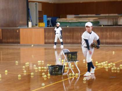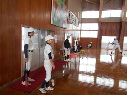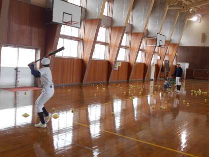 新年初部活動〜野球部〜 公開日 2022/01/04 更新日 2022/01/04 山室中学校のページ 1月4日(火) 第2体育館では、野球部が練習中です。「明けましておめでとうございます。」と言うと、元気な挨拶が返ってきました。 テニスボールを利用して、バッティング練習をしています。