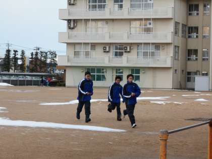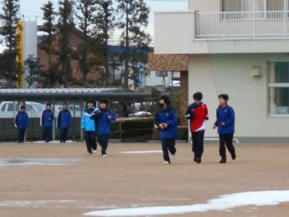 バドミントン部は寒さにもめげず、外周を走ってまずはウォーミングアップです。