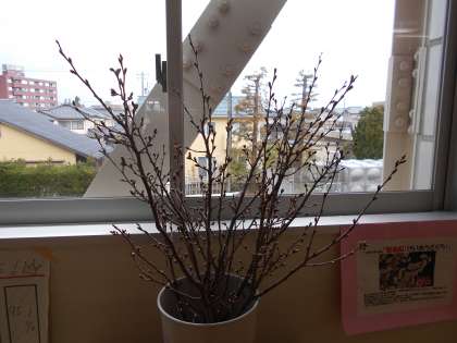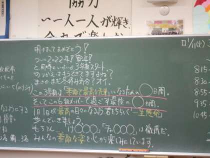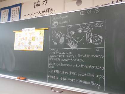教室では先生方の黒板メッセージや、3年生の階では、桜がお出迎えしました。「啓扇桜」とは冬に花を咲かせる桜だそうです。開花が楽しみですね。