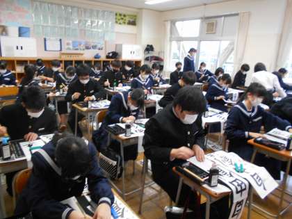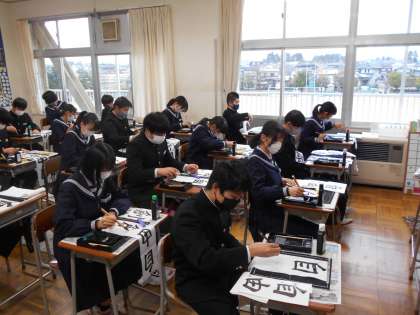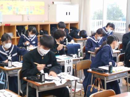 1月11日(火) 2年生は「自由創造」と書きます。冬休みの練習の成果はしっかり発揮できたかな?