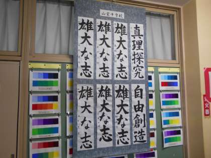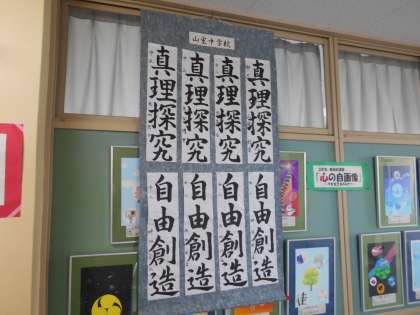 書き初め大会作品を鑑賞しよう!その2 公開日 2022/01/12 更新日 2022/01/12 山室中学校のページ 1月12日(水) 職員室前には、各学年の金賞作品がずらり。これを機会に、各学年の力作をご覧ください。