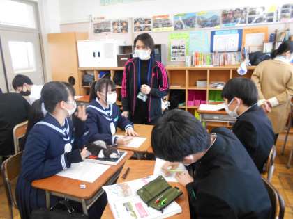 3年生 授業風景 公開日 2022/01/13 更新日 2022/01/13 山室中学校のページ 1月13日(木) 3−3国語:漢検のポスターを見て、評価文を書いています。 3−4数学:直角三角形の図形を使って問題を解いています。 3−5理科:年間の二酸化炭素の増減のグラフから、その理由を予想しています。