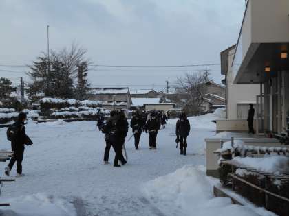 今朝も冷え込みが厳しく、玄関前は雪が凍り付いてバリバリになっていました。しかし、うっすらと青空も見え、雪は峠を越したようです。もうしばらく人も車も滑りやすく危険な日もあると思いますので、交通事故等に気を付けて登校してください。