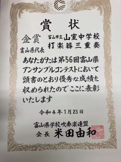 県アンサンブルコンテスト 公開日 2022/01/23 更新日 2022/01/23 山室中学校のページ 1月23日(日) アンサンブルコンテスト打楽器三重奏が、金賞、県代表となり、北陸大会に進出することになりました。これまでの努力の成果ですね!おめでとうございます!