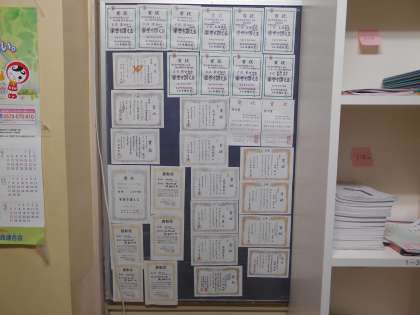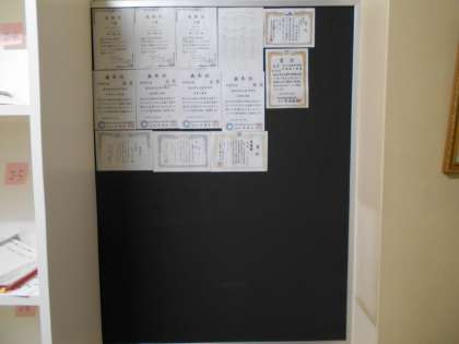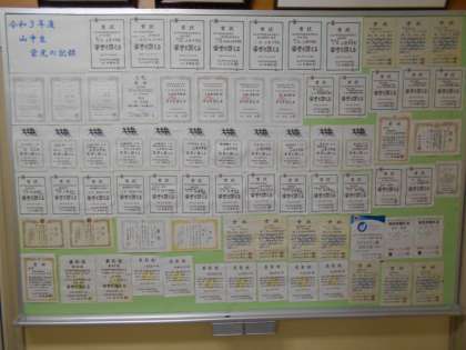 栄光の足跡 公開日 2022/01/24 更新日 2022/01/24 山室中学校のページ 1月24日(月) 職員室前には、この1年間でいただいた賞状がずらり掲示されています。始めは1枚だった掲示板も、2枚、3枚と賞状が貼れるように増設しました。部活動の輝かしい功績の数々、素晴らしいですね。