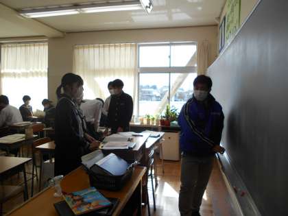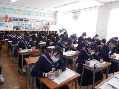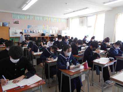 3年生 授業風景 公開日 2022/01/31 更新日 2022/01/31 山室中学校のページ 1月31日(月) 1月もいよいよ最終日となりました。3年生は、模擬テスト形式でプリント学習を行っています。答え合わせでは、分からないところを先生方に質問し、解決しています。 (写真上:3−2国語、中:3−4英語、下:3−5社会)