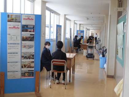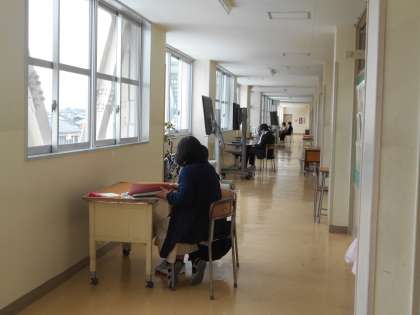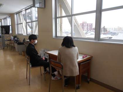 1、2年生の教室前では、教育相談を進めています。短い時間ではありますが、担任の先生も生徒も、柔らかな表情で話しています。