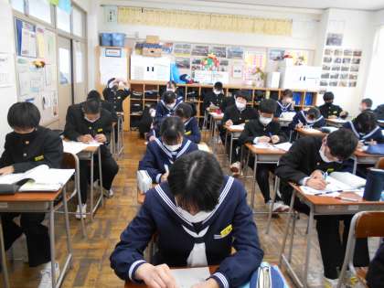 定期考査の範囲表を配布しました。範囲表をじっくり眺め、早速計画表を作成しています。友達の良い点を真似て工夫しようと、見に行く生徒もいます。1年生は、4回目の定期テストになりますね。計画表をしっかりと立てて、見通しをもって取り組みましょう。
