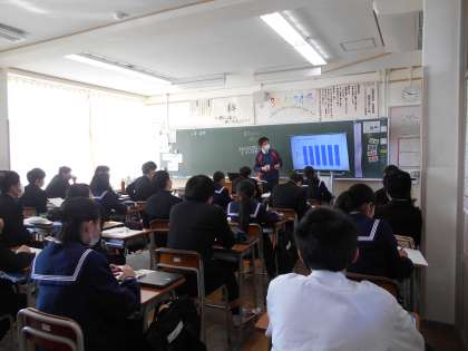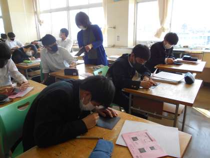 2年生 授業風景 公開日 2022/02/14 更新日 2022/02/14 山室中学校のページ 2月14日(月) 2−1美術:アクリル板の黒い塗料を、それぞれ表現を工夫しながら削っています。 2−5数学:さいころを5組のみんなが振ったとき、1〜6の目が出る相対度数は? 2−6技術:電気について、パワーポイントを使ってまとめよう!