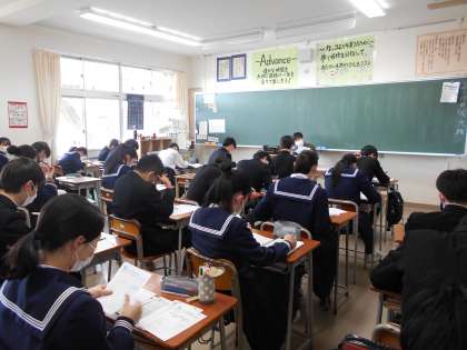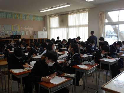 3年生 授業風景 公開日 2022/02/15 更新日 2022/02/15 山室中学校のページ 2月15日(火) 3−1社会:テスト形式でプリントに取り組んでいます。 3−2英語:プリント学習の後の、直しを丁寧にやって力を付けます。 3−4国語:テストの正しい答え方について説明を聞いています。「理由を書くときは、〜からを忘れないようにね!」