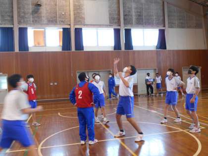 2−1,2体育:バスケットボールです。自分の役割をチームプレーの中で果たすことをめあてに取り組んでいます。
