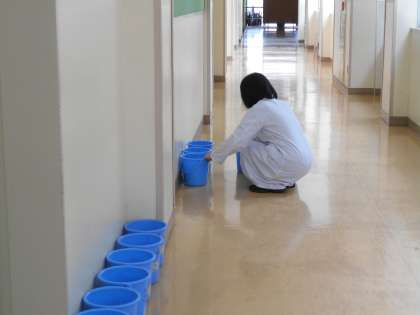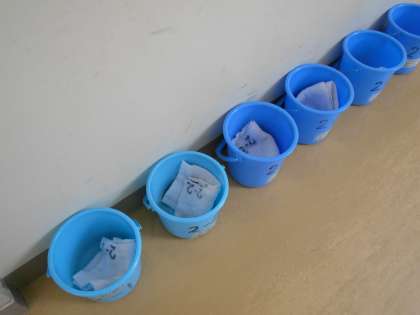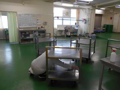 いつもありがとうございます! 公開日 2022/02/16 更新日 2022/02/16 山室中学校のページ 2月16日(水) 午前10:00、1階の給食室前廊下に給食消毒用のバケツが並びます。配膳室の中では、ワゴンの消毒が始まります。 配膳員さん、いつも衛生的で安全、安心して給食を食べることのできる準備をありがとうございます!