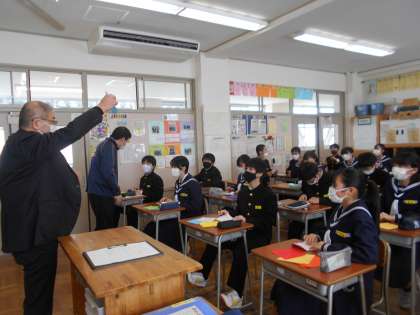 1年4組の道徳のスペシャルゲストは・・・校長先生です。生徒には内緒にしていたので、直前までそわそわしていました。