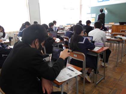 1−1社会:クロムブックに入れた資料を見ながら、ワークシートを書いています。