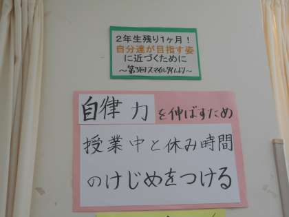 2年生 スマイルアクション!〜学級力向上プロジェクト〜 公開日 2022/02/25 更新日 2022/02/25 山室中学校のページ 2月26日(金) 2年生では、先日のスマイルタイムを受けて、各クラスで重点目標を決めて取り組んでいます。まだまだクラスの最後の1日まで、成長し続けようとする姿勢、素晴らしいですね。