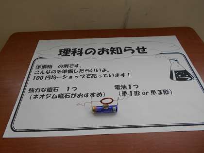2学年の廊下には、100円ショップなどで購入できるミニ実験装置が置かれています。今まさに学習中の単元なので、興味が湧きますね。