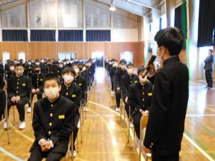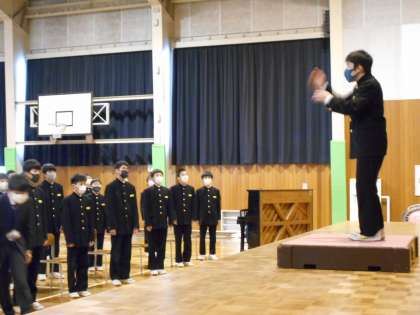 1年生 合唱練習 公開日 2022/03/08 更新日 2022/03/08 山室中学校のページ 3月8日(火) 1年生は、体育館で距離をとる、換気をするなど、マスクをして感染症対策をとりながら、来年度の新入生に届けるための合唱練習をしました。 指揮者、伴奏者や学年協議会のリーダーが練習の進行をしています。 新入生に先輩として初めて聞かせる歌声になるので、喜んでもらえるように頑張ります!