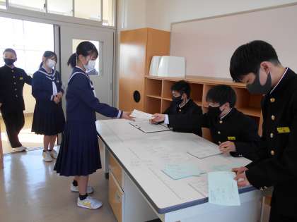 1年生 投票 公開日 2022/03/09 更新日 2022/03/09 山室中学校のページ 3月9日(水) 選挙管理委員が、きびきびと場を仕切ってくれています。こちらも粛々と落ち着いた雰囲気で投票に臨みます。