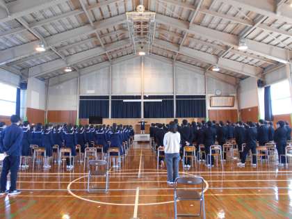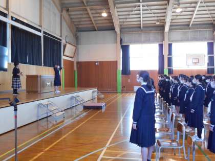 3年生 卒業式練習 公開日 2022/03/11 更新日 2022/03/11 山室中学校のページ 3月11日(金) 3年生は体育館で、同窓会入会式、卒業式の練習です。式歌は「旅立ちの日に」を歌います。さびの部分は、3年間の学舎を巣立つ思いを込めて歌います。3年生のみなさん、当日は、心に響く歌声を届けてくださいね。