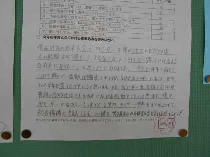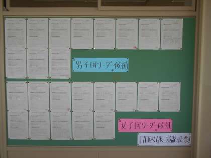 令和4年度の体育大会に向けて、1年生も団リーダー決めをします。立候補者の作文が掲示されました。作文から、どの立候補者も意気込みが伝わってきます。