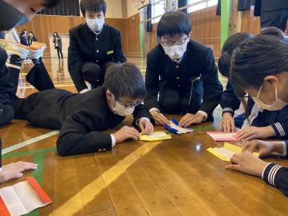 1学年レクリエーション2 公開日 2022/03/23 更新日 2022/03/23 1学年 紙飛行機飛ばしは、折り方を教え合いながらよく飛ぶ紙飛行機を折っていました。なんと19mも飛んだ人もいましたよ。 また、最後には学年主任の先生に協力してもらい、オンライン形式で楽しくビンゴ大会が行われました。入賞者はみな、嬉しそうにしていました。