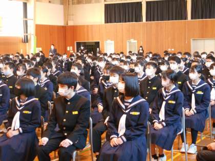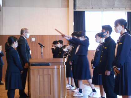 生徒会役員認証式 公開日 2022/03/24 更新日 2022/03/24 山室中学校のページ 3月24日(木) 旧生徒会役員の挨拶の後、新生徒会役員の認証式を行いました。緊張しながらも、1、2年生との前で堂々と委任状を校長先生から受け取りました。