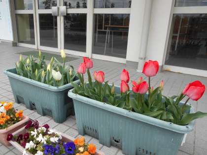 玄関先は春爛漫です! 公開日 2022/04/04 更新日 2022/04/04 山室中学校のページ 4月4日(月) 17:00 玄関先のチューリップが、太陽に向かって咲いています。 1週間前はまだ葉っぱだけしか見えていなかったのに、びっくりです。 まだつぼみの鉢もあるので、何色のチューリップが咲くのか楽しみですね。 始業式の日は、色とりどりのチューリップとパンジーが玄関先で迎えてくれることでしょう。 お楽しみに!