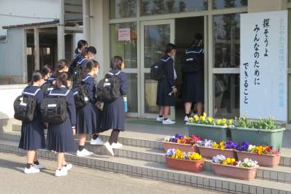 ▼生徒玄関では、チューリップ、パンジー等がお出迎え!
