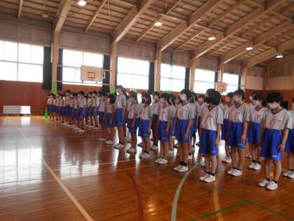 2年・授業風景・その2 公開日 2022/04/13 更新日 2022/04/13 2学年 4月13日(水) 3限 2年4,5組の保健体育は、集団行動の練習をしていました。 「回れ-右!」「気を付け!」「番号!」 2年目ともなれば、なかなかテキパキと行動できていますね。