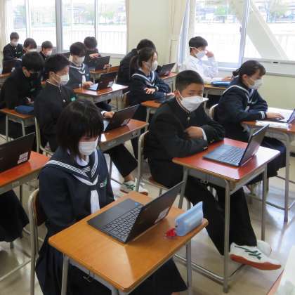 校長先生の講話のあと、山室中学校の思い出のスライドをクロムブックで振り返りました。