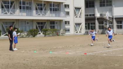 1年3組男子の体育は、グラウンドで75m走のタイムを計っていました。