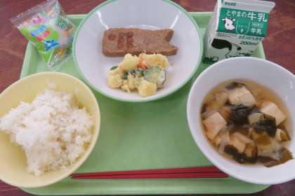今日の給食の献立は、「こどもの日スペシャル、ごはん、牛乳、鯉のぼりハンバーグ、ポテトサラダ、若竹汁、かしわもち」です。(写真:上)