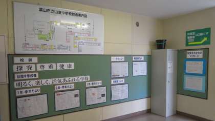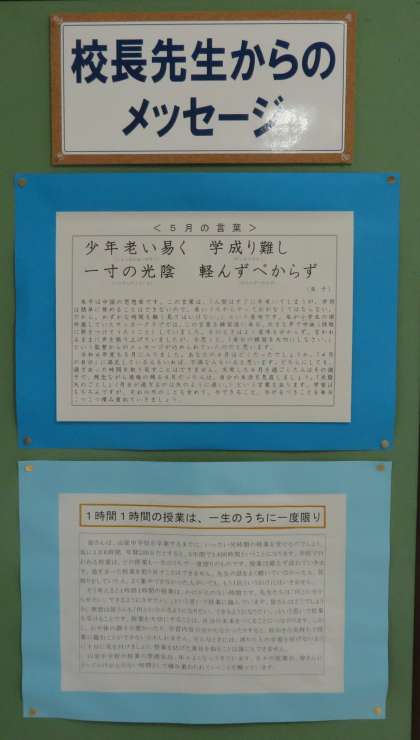 正面玄関前の掲示板にある「校長先生からのメッセージ」も5月更新しています。