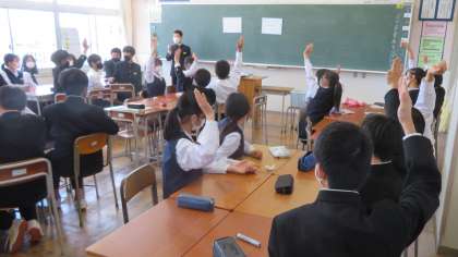 2年5組の学活は、学級目標のデザインを決める学級会をしています。
