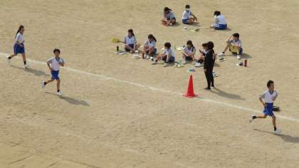 2年3組の体育は、グラウンドで、長距離(男子1,5000m、女子1,000m)のタイムを計っています。