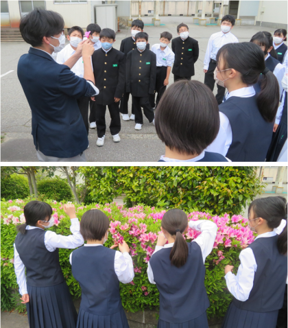 教職員駐車場の垣根のツツジをとってきて(写真:上段)、花全体を観察したあと、分解して花のつくりを観察しました。(写真:下段)