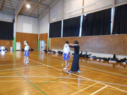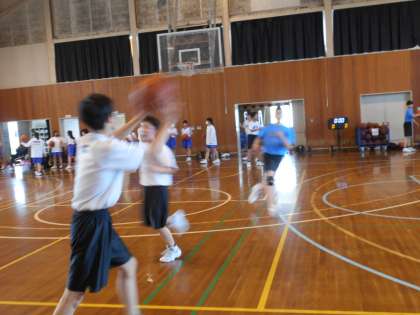 体育館では、バスケットボール部とバドミントン部がウォーミングアップを始めました。