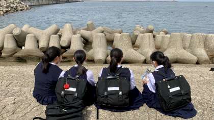 5月17日(火) 14:30 万葉埠頭付近 海を見ながら語らっっています。(青春です!)
