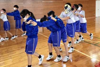 メンバーは目隠しをして一列に並び、前の人の肩に手を置きます。