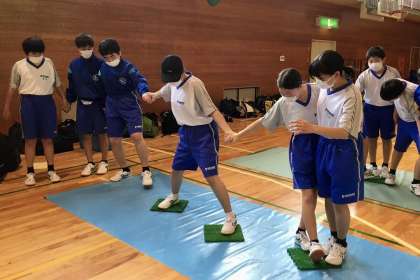 全員で手をつなぎ、スタート地点からストーンを足で並べ、その上を渡りながら、ゴールまで移動します。