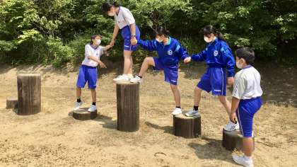全員で手をつなぎ、手を離さずに丸太を渡ります。