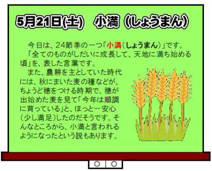今日は「小満(しょうまん)」です! 公開日 2022/05/21 更新日 2022/05/21 山室中学校のページ 5月21日(土) 8:00 気温は20度、天気はくもり。 今日は、24節気の一つ「小満(しょうまん)」です。