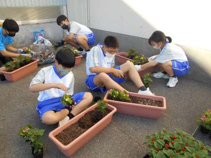 環境委員会は、180株のお花の苗を植え、教室のベランダに置く準備をしています。