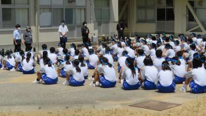 結団式の後、団ごとに集合し、団リーダーや団顧問の紹介(写真:上)をし、団演技の練習(写真:下)に入りました。