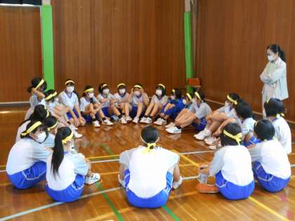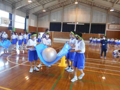 1年・学年競技練習 公開日 2022/05/27 更新日 2022/05/27 1学年 5月27日(金) 3限 あいにくの雨で、グラウンドには大きな水たまりができ、今日の学年競技練習は体育館で行っています。 各団、走順や配置等の作戦を練っています。 1年生は、初めてブルーシートをもって、ボールを運びました。 なかなかこつがいるようです。