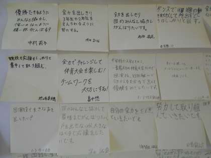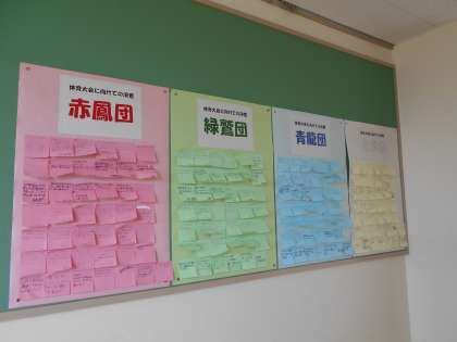 1年・各団の意気込み 公開日 2022/06/01 更新日 2022/06/01 1学年 6月1日(水) 15:00 1年生は初めての体育大会に向けて、各団の意気込みを掲示しました。 思い出に残る体育大会にしたいという思いが、伝わってきます。