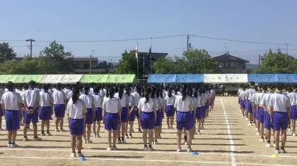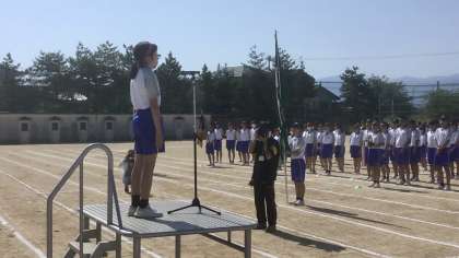 第76回 体育大会・その4 公開日 2022/06/02 更新日 2022/06/02 山室中学校のページ 6月2日(木) 8:30 江上体育大会実行委員長の開会宣言で、開会式が始まりました。 そのあと、国歌斉唱、国旗・校旗の掲揚です。